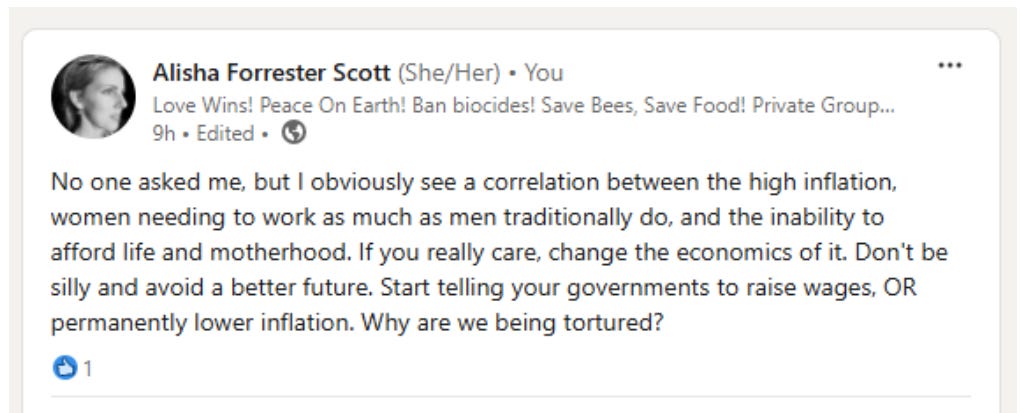 Summary: I like asking chatbots questions. I like leading them to advocate for me as a human. Such as, phrasing questions that make me correct. In my opinion, I see an obvious correlation between the high inflation, women needing to work as much as men traditionally do, and the inability to afford life and motherhood.